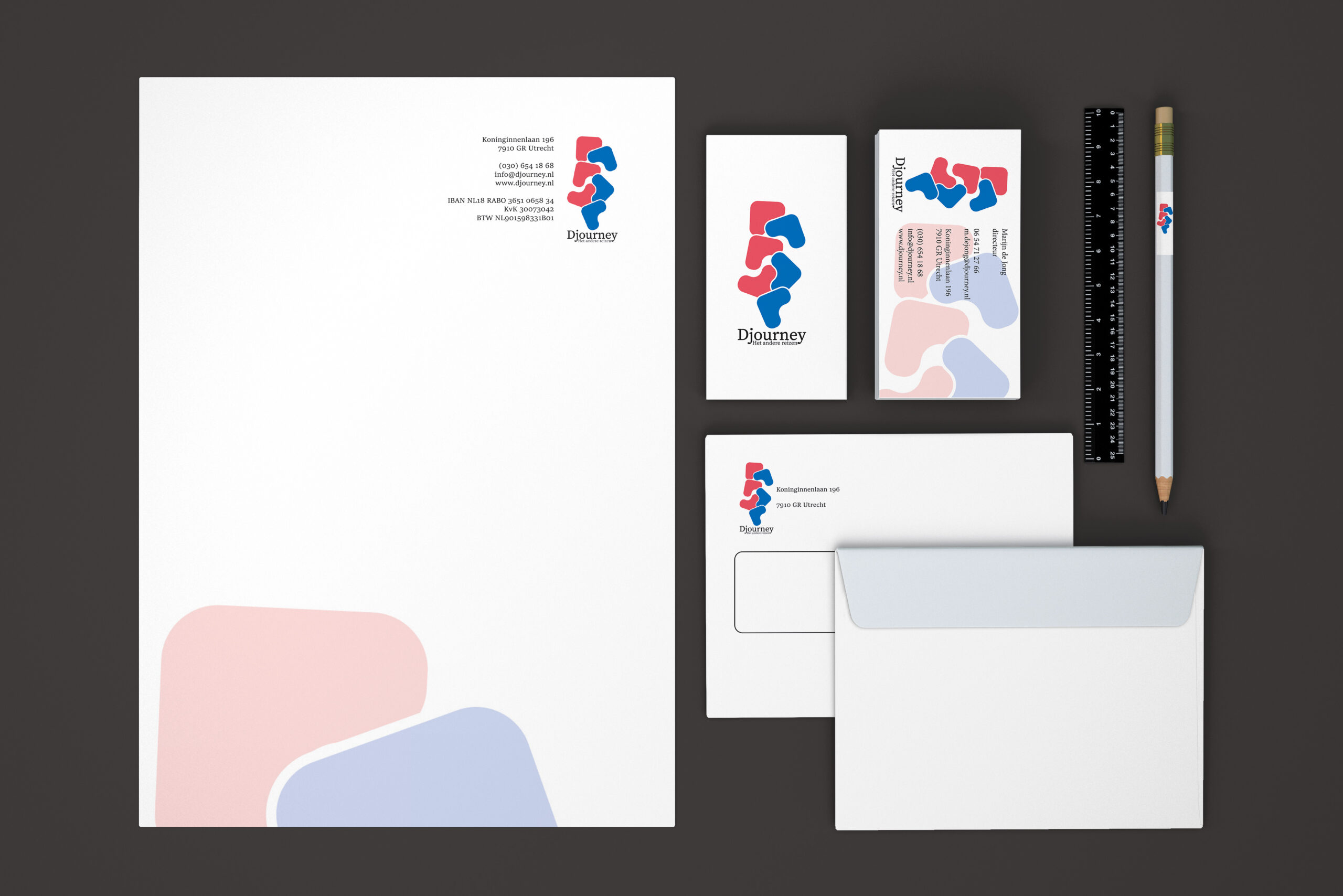 Dit project was voor een reisbureau, waarvoor ik, zoals je kunt zien, een bijpassende correspondentieset moest ontwerpen, inclusief briefpapier, envelop en visitekaartjes. Het logo is ook door mij ontworpen